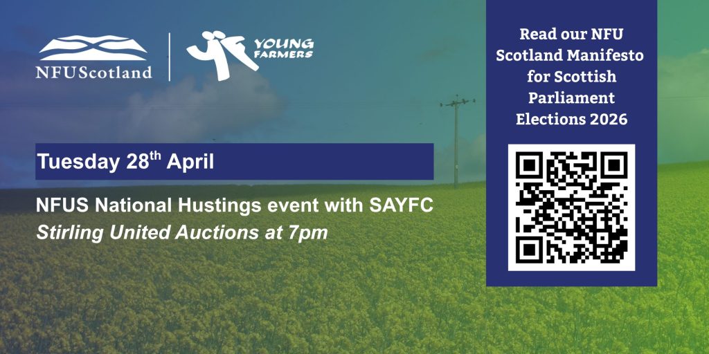 NFU Scotland, in partnership with the Scottish Association of Young Farmers Clubs, will host a key National Hustings Event on 28 April at Stirling Mart (United Auctions), bringing together leading political voices and the next generation of farmers and crofters.